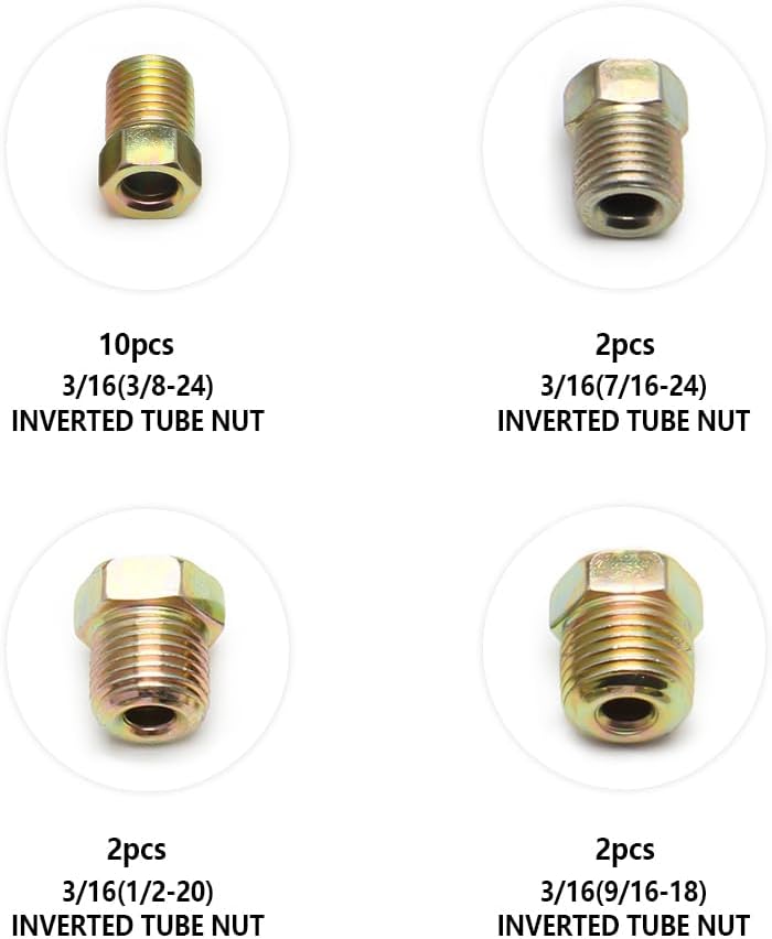 ⭐ 【Universal Brake Line Kit】 The packaging contains 1x brake line and 16x brake line fittings. Brake line L=25 feet, ID=3/16 inch (3.3mm), OD=4.8mm, T=0.028 inch (0.7mm). The dimensions and quantities of inverted tube nuts are:10x 3/16″ (3/8-24) inverted tube nuts, 2x 3/16″ (7/16-24) inverted tube nuts, 2x 3/16″ (1/2-20) inverted tube nuts, and 2x 3/16″ (9/16-18) inverted tube nuts.